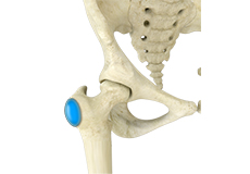 The hip joint is a “ball and socket” joint. The “ball” is the head of the femur or thighbone, and the “socket” is the cup-shaped acetabulum.